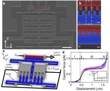 La force de Casimir a été donc mesurée entre deux réseaux rectangulaires en silicium sur une plateforme ad hoc permettant leur interpénétration (voir figure). La possibilité d’interpénétrer les deux réseaux micrométriques tout en gardant le parallélisme et la sensibilité de la mesure était l’enjeu expérimental majeur. Du point de vue théorique, la complexité venait de la difficulté de prédire avec précision et sans paramètres d’ajustement les fluctuations du vide quantique dans cette géométrie.