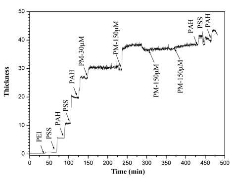 Thickness of PEI-(PSS-PAH)2-PM30- (PM150)x3-PAH-PSS-PAH polyelectrolyte multilayer; PM- purple membranes
