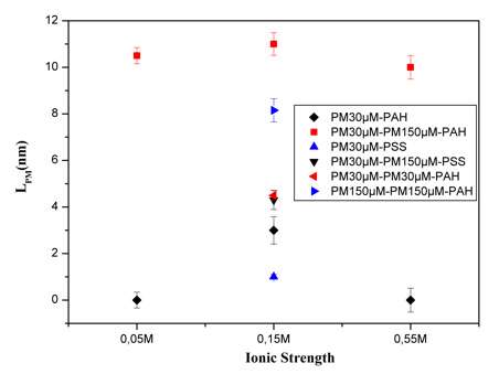 Thickness of PM layers on various polyelectrolyte films and different ionic stengths.