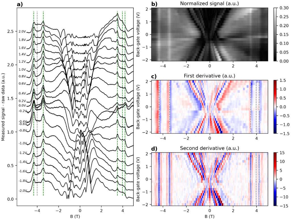 Signal de photoconductivité mesuré en fonction du champ magnétique, pour différentes tensions de grille arrière. La caractéristique en forme de X à faible champ indique la présence d’oscillations de type Shubnikov-de Haas. À des champs magnétiques plus élevés, plusieurs transitions apparaissent nettement sous forme de lignes verticales. La valeur absolue du signal normalisé est représentée sous forme de carte de couleurs b), avec la dérivée première et seconde en c) et d). Crédit : Phys. Rev. B 106, 245141 (2022)