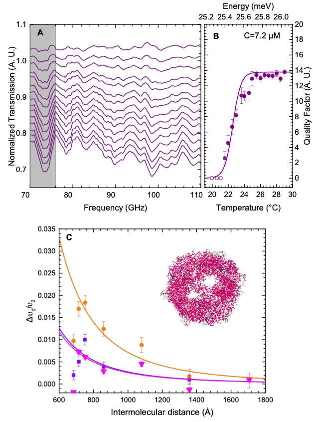 Ce thème s’intéresse au comportement des protéines en solution aqueuse grâce à des Laboratoires-sur-Puce utilisant la photoconductivité THz en régime de champ proche (Figure (a)). L’objectif est de mettre en évidence des phénomènes similaires à ceux observés en physique du solide, comme la condensation de phonons [Phys. Rev. X 8, 031061 (2018)]. Les protéines possèdent des modes vibratoires, appelés modes normaux. Lorsque l’apport d’énergie dépasse un seuil critique (Figure (b), une transition de phase se produit : l’énergie n’est plus répartie uniformément entre les différents modes, mais se concentre dans celui de plus basse fréquence, au détriment des autres. Ce phénomène, appelé condensation de phonons, entraîne sous certaines conditions de concentration et d’énergie l’apparition de forces électrodynamiques à longue portée [Science Adv., adv0346 (2025) ; Science Adv., abl5855 (2022)]. Ces forces agissent sur des distances deux ordres de grandeur supérieures à celles mises en jeu par les interactions classiques comme les forces de van der Waals ou les liaisons hydrogène. Elles pourraient offrir un éclairage inédit sur les mécanismes qui régissent l’organisation intracellulaire.