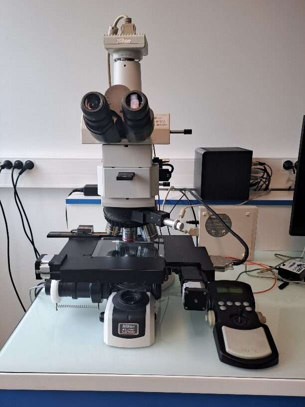 - Un microscope Nikon équipé d’une source stable et d’un spectromètre, permet l’observation des échantillons, ainsi que des mesures de réflectométrie (en particulier pour les mesures d’épaisseurs).