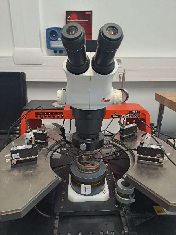 - Un testeur sous pointe équipé de 4 pointes et d’une petite bobine pour les tests préliminaires à l’air de composants (résistance de contact, dopage et mobilité).