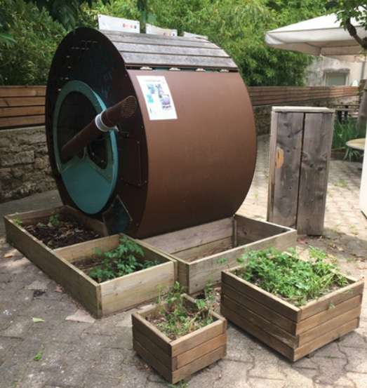 Composteur-fontaine instrumentalisé installé sur le parvis de la cafétéria de la Faculté d’Éducation de Montpellier. Ce composteur est équipé pour mesurer divers paramètres tels que la température, l’humidité et la concentration de gaz (CO₂, CH₄, N₂O), afin d’étudier et d’optimiser le bilan carbone du compostage.