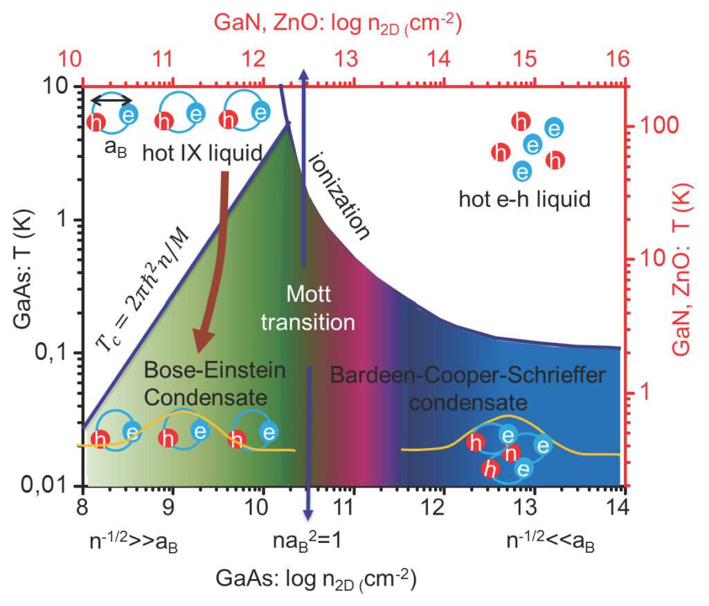 À faible densité, la diminution de la température du fluide d’excitons conduit à un condensat de Bose-Einstein (BEC). À des densités plus élevées et à basses températures, une séparation de phase est prédite entre des condensats de type Bose-Einstein et Bardeen-Cooper-Schrieffer (BCS).