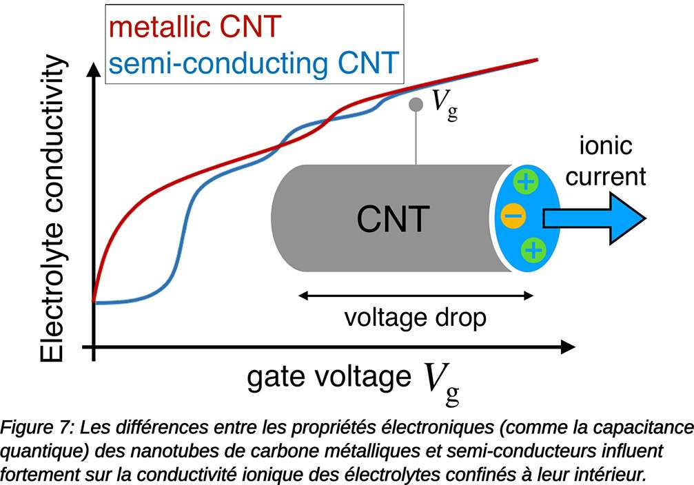 Nos travaux mettent en lumière des effets clés tels que le glissement hydrodynamique, la régulation de charge, ou encore l’impact des propriétés électroniques des matériaux (comme la capacitance quantique des nanotubes de carbone) sur la conductivité ionique.