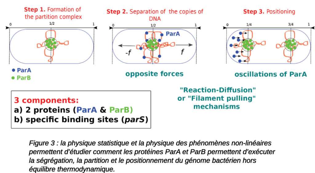 - la ségrégation et le positionnement du génome bactérien via des mécanismes actifs (hors équilibre thermodynamique);